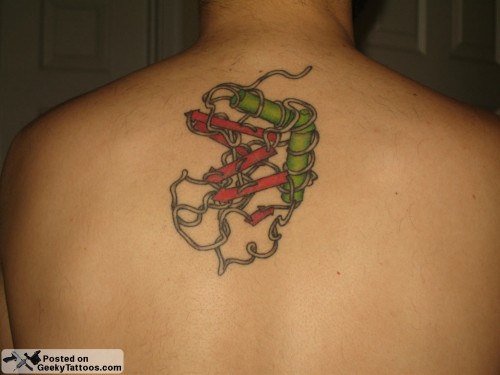 My name is Brian, and I got a tattoo at a shop called Good Fortune Tattoo in Savannah Georgia by an artist named Hime. It is a tattoo of a 3d representation of the signaling portion of a protein called Shh (this stands for Sonic hedgehog). I got the tattoo because I am a cell biology student and love the ridiculous naming of proteins done by the geneticists which discover it. I figured, for my first tattoo, it might as well be something completely unique. I love it though, great conversation starter and very few people have any idea of what the hell it is at first glance.
