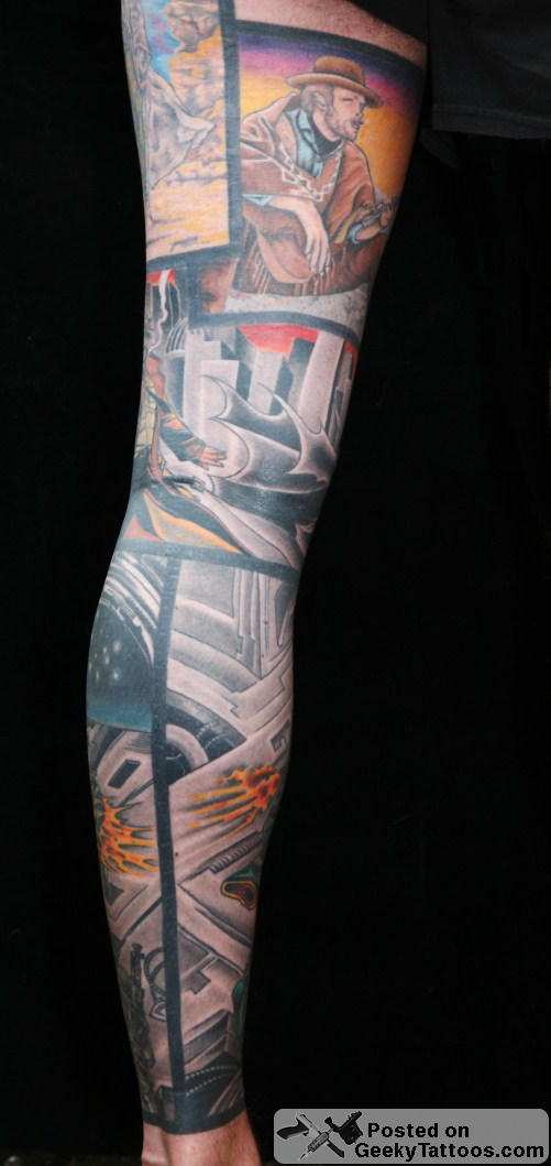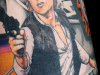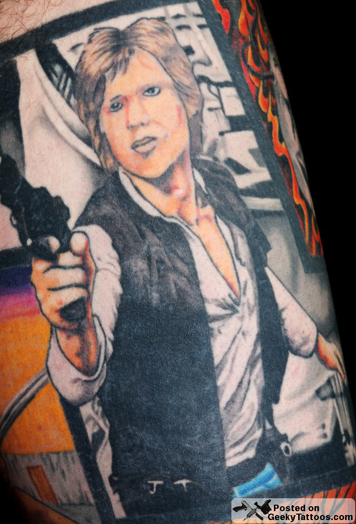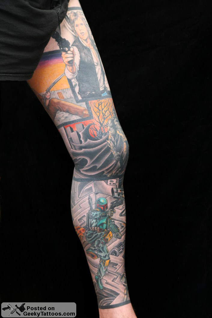 I got my first Star Wars tattoo 11 years ago in the form of the Mandalorian logo on my back. Since then I have sleeved my whole left leg with Star Wars and other movie / comic related images. I started with the Crow piece on my thigh, that was done by 2 different artist (I don’t know the names of either, the bird was done by an artist in Birmingham UK and the mask by a guy in South Australia). I then added the Saint of Killers (from the Preacher comics) and Han Solo and The Man With No Name (Clint Eastwood in For a Few Dollars More). These were all done by Danny at Studio 81 Manchester (UK). I decided to divide the tattoos up with the thick border to give it a comic book feel.
