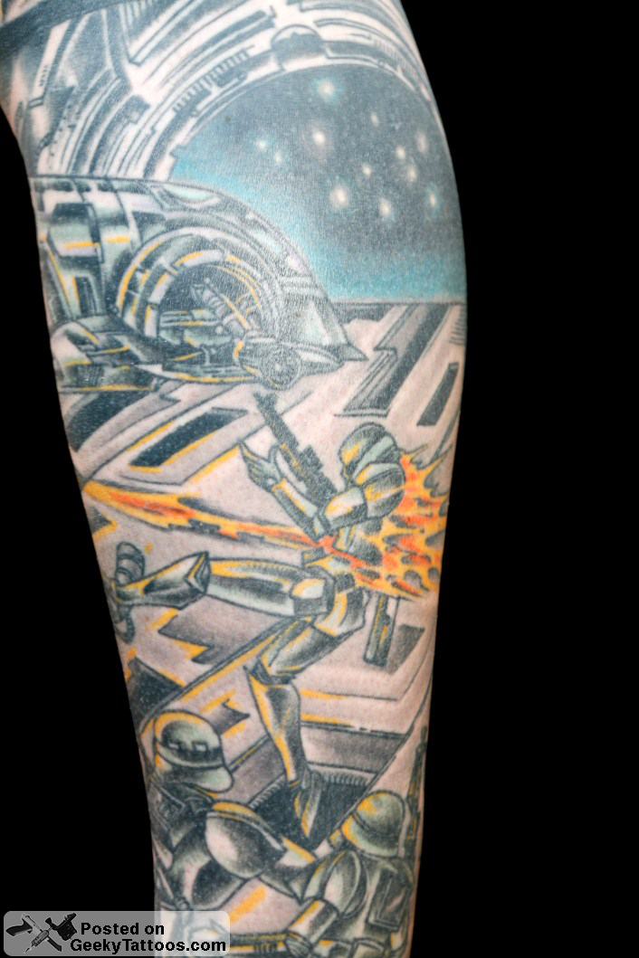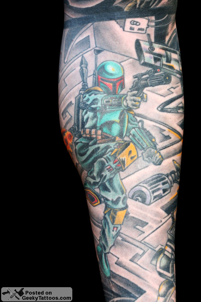 Once my thigh was complete I moved onto my Boba Fett calf piece. This was designed and tattooed by Bara at True Love Tattoo in Madrid. This piece also won 2 place in the Star Wars tattoo competition at Celebration 4 in Los Angeles.