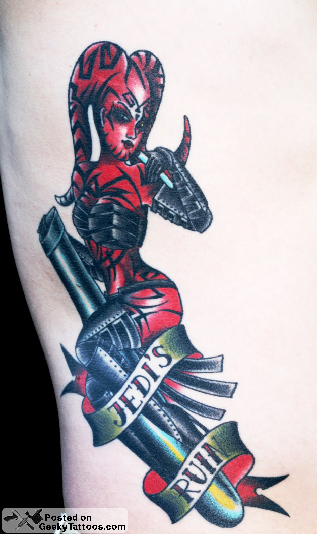 The Jedi’s Ruin rib piece is based on Darth Talon from the Star Wars Legacy comics, and was designed around the classic mans ruin tattoo. Also done by Bara.