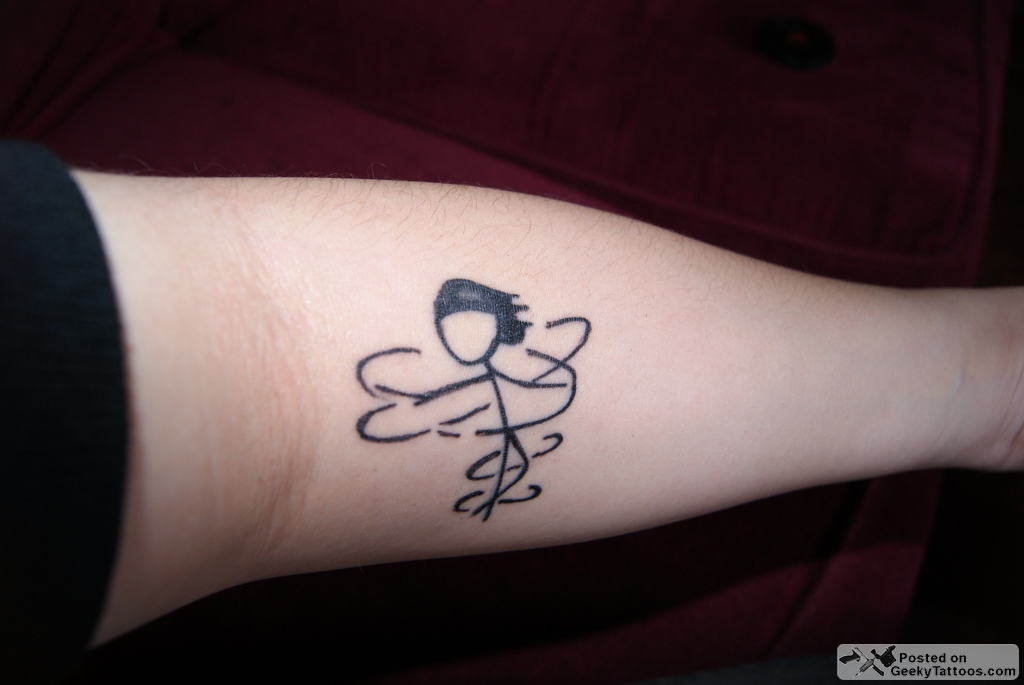 I’ve posted about xkcd tattoos before, but now there’s a new one to add to the collection! Rebecca went out and got the spinning girl from the Angular Momentum comic tattooed on her arm. Much like the comic, there was a lot of sentiment behind the ink:
