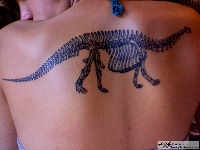 Charlotte shares her geeky tattoo with us. It’s a brand new tattoo based on a scientific illustration of a brontosaurus from the late 1880s.