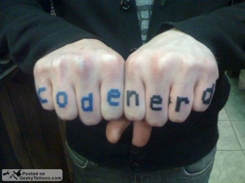 Jesse McPherson, obviously a programmer, is the owner of the above knuckle tattoos. He said he got them done at “some pirate themed tattoo shop in LA”. He chose the font that he normally codes in, blew it up to get it pixelated and then did one hand blue and the other hand black to symbolize the always useful syntax highlighting. In addition to the knuckle tattoos, Jesse’s also got “code” tattooed on his inner lip.