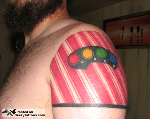 I just got my latest geeky tattoo finished and wanted to share. It’s a quarter sleeve representation of the control panel from a Neo Geo MVS arcade system. I’m a life long gamer and I always wanted a Neo Geo console growing up but could never afford it. Once I was older I got into arcade collecting and discovered that the arcade systems are pretty affordable (in terms of money, not space). I bought a one slot Neo Geo that had been installed in a Street Fighter II Championship Edition cabinet and have since upgraded to a 4 slot “Big Red” MVS system that I did a pretty substantial restoration on (still a work in progress). Neo Geo is hands-down my favorite system in terms of replayability and general fun so I figured it was a good place to start a video game themed sleeve.