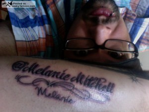 A week ago I posted about Drew Olanoff’s offer to get a tattoo of the Twitter username of the person willing to donate the most money to the Make-A-Wish foundation. The bidding quickly escalated (we even put a bid in!) and when midnight on Monday struck, Melanie Mitchell had won with a bid of $2112. True to his word Drew went and got her username inked down at Cold Steel yesterday. Drew had to explain what Twitter was to his artist, Ricket, but he was more than willing to put some more ink into Drew’s skin.