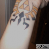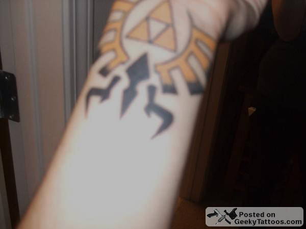 Bridget Phipps is a huge Nintendo fan who took her favorite video games and tattooed them on her body. She’s got three of the classics: Duck Hunt, Legend Of Zelda, and Resident Evil (the text is the Umbrella Corp motto from the 1st RE). There’s some joke in here about a light gun in her pocket, but we’re above that sort of humor here at GeekyTattoos.com. Wait, no we aren’t. It IS a light gun in her pocket, but she’s also happy to share her tattoos with everyone.