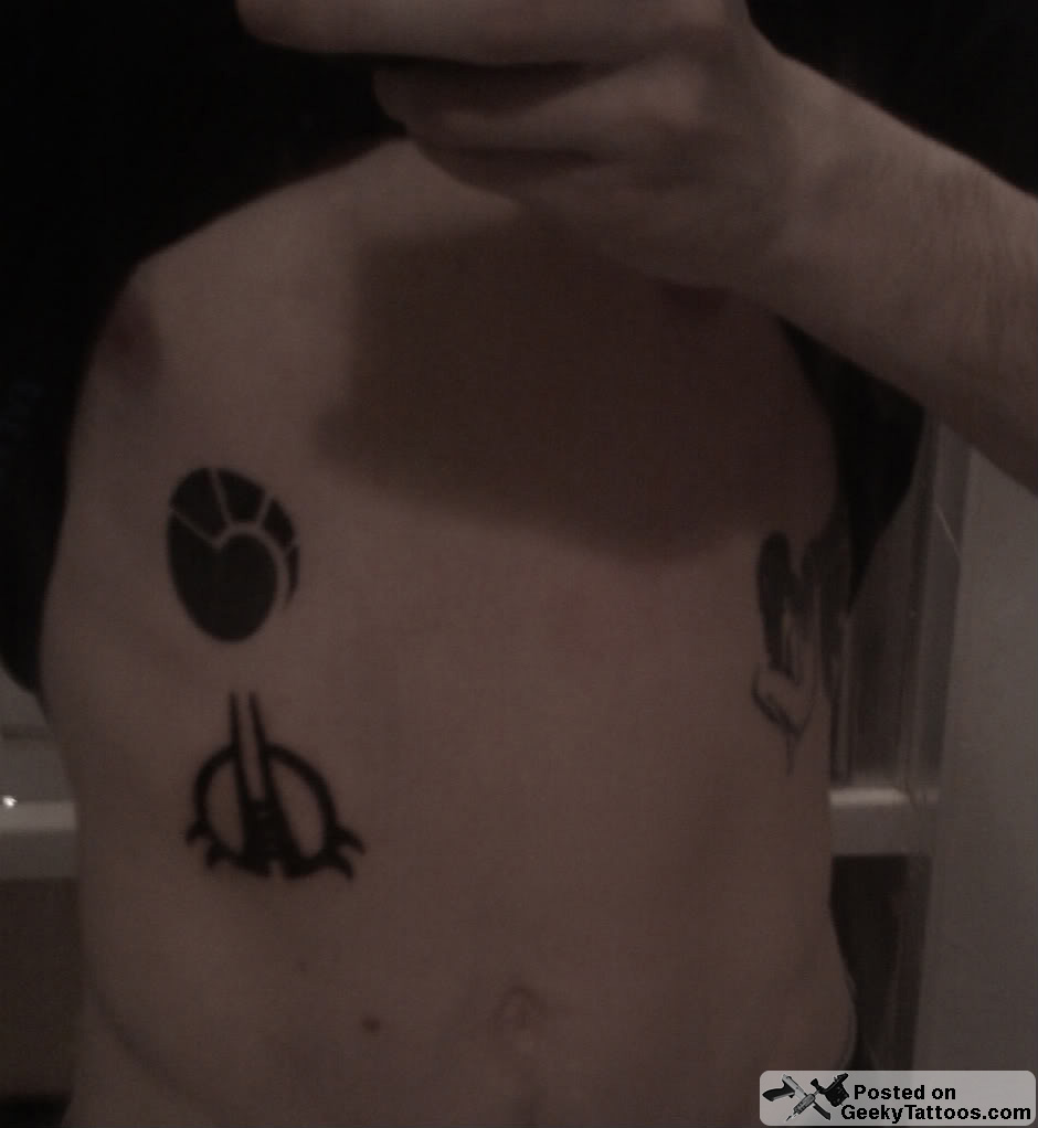 These 2 symbols, are in my game race and clan symbols, Minmater (top) and Sebestior (bottom). The Minmator one I got at EvE fanfest last year, they had a booth for people who wanted EvE related tattoos right at the event. I remember the parlour was Reykjavik Ink but unfortunately I forget the guys name. I really liked the symbol and for me it means not just my love for the game, my in game character, my badass race, but also the week I spent in Iceland with the thousands of other EvE fanatics, which was the most crazy and fun time ever. I’ve never met so many cool new people in a short period of time, all brought together by this devotion to a niche game. After I got home I wanted to finish off the set with the clan symbol, I think it compliments it so I see it as more of an extension rather than a totally seperate piece, I got it in SnakeBite Tattoos in Dublin.