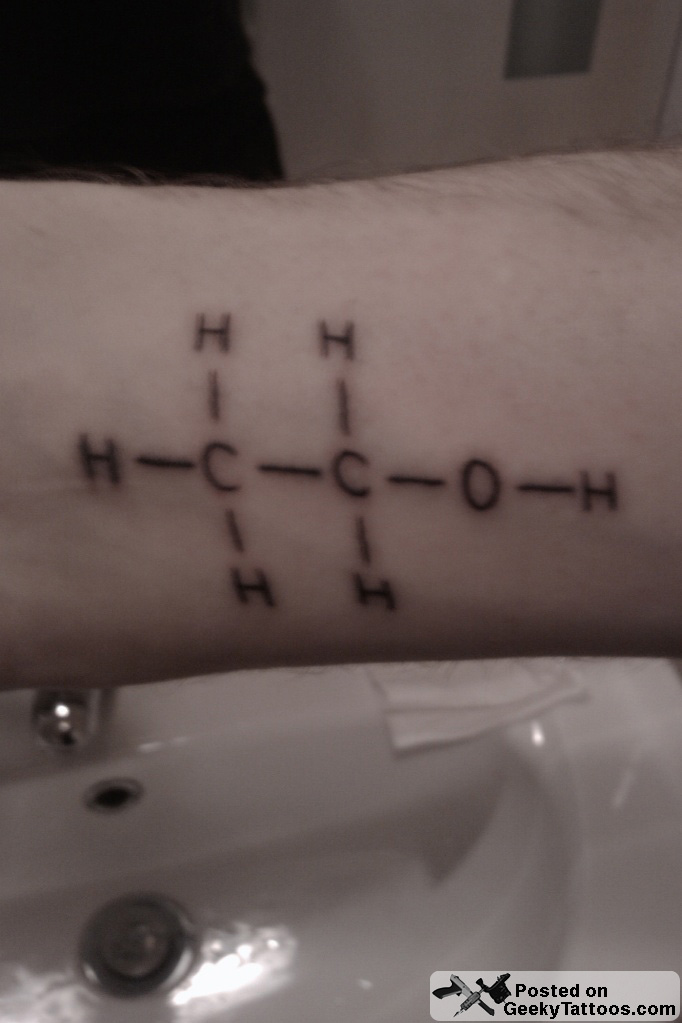 Also this week for added geekiness I got formula for ethanol (aka the kind of alcohol in booooze) on my right wrist, my drinking hand. Also got it in SnakeBite. I like to think its meaning is pretty obvious, who dosent love booze? but rather than getting a bottle or brand name I wanted something more….encompassing of alcohol in general, hence I picked a chemical formula to display my love.
