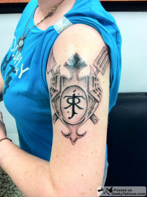 Hey there! My name’s Meri and last night I got an awesome tattoo, as a tribute to some of my geeky fandoms. I call it my Fandom Crest. I’m a huge lover of all things Lord of the Rings, Lost, Star Wars, Harry Potter, and Weird Al Yankovic, so there are bits of them in the tattoo. Dharma Symbol for Lost, Potter’s lightning bolt, the Rebel Alliance symbol, Tolkien’s initials in the middle, and some spatulas (Spatula City via UHF) to make it extra white and nerdy. I give all credit to Tony Scambony at Fuzion Ink (http://www.hellhoundmusic.com/fuzionink/) for the awesome design and artistry. Hope you like it too!
