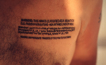 Pointing out the obvious ridiculousness of the enforcement of these restrictions, the incredibly short perl code above was passed around, printed on shirts, and tattooed on people. Technically you would be breaking the law if you walked down a US street displaying this code (on a shirt or skin) and a foreign citizen observed it. Pretty crazy, eh?