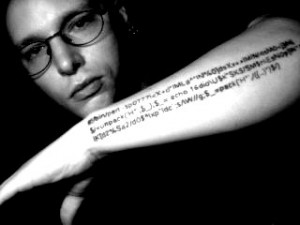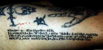 For those that aren’t cryptography geeks, the above tattoo is an implementation of RSA encryption and decryption in perl. RSA is a handy way to encrypt something so prying eyes can’t see your porn important free-speech writings. Back in the early 1990’s some cryptography software was illegal to export out of the US due to the International Traffic in Arms Regulations (ITAR). If encryption software used more than 40bits, it was classified as munitions (along with chemical and biological weapons and other military technology). If you were poking around on the web in those days, you might remember Netscape having both a US and an International version of their browser. The US version used 128bits to encrypt SSL transactions (like credit cards) whereas the International version only used 40bits, conforming to the regulations.