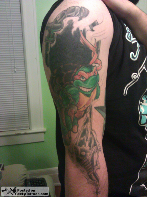 Sometimes you make a mistake in getting a tattoo when you’re younger. Matt made one and got a very un-geeky tattoo of “some stupid tribal” crap. Luckily he realized the error of his ink and redeemed his geek cred with a cover-up that showcased his favorite Turtle as a kid, Michelangelo.