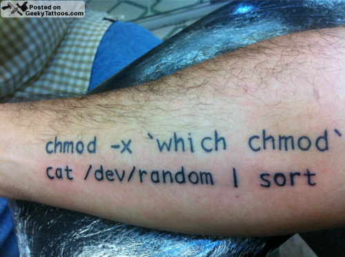 Jason is a man of few words. He sent in his tattoo and just said: “dumb unix commands”. I couldn’t have said it better.