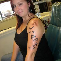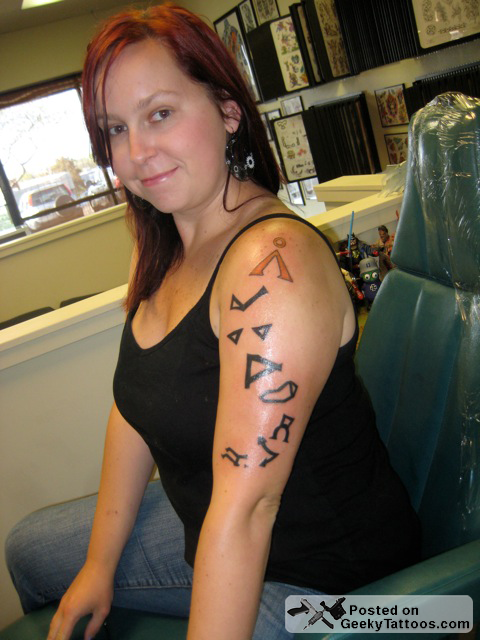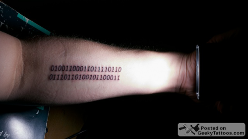 One of the best things about geeks is the amount of time and thought they put into just about anything they do. Joe DiCastro is a hacker, photographer, and writer who has put a lot of thought into the significance of the tattoo he chose. The binary translates to “logic”, one of Joe’s passions, but even more important was the font that Joe chose. He went with Verdana because he “wanted a humanist sans typeface” that “links the Web to Gutenberg”. If you want to read more in depth on his choice, head on over to his blog post: New Tattoo – “Logic”
