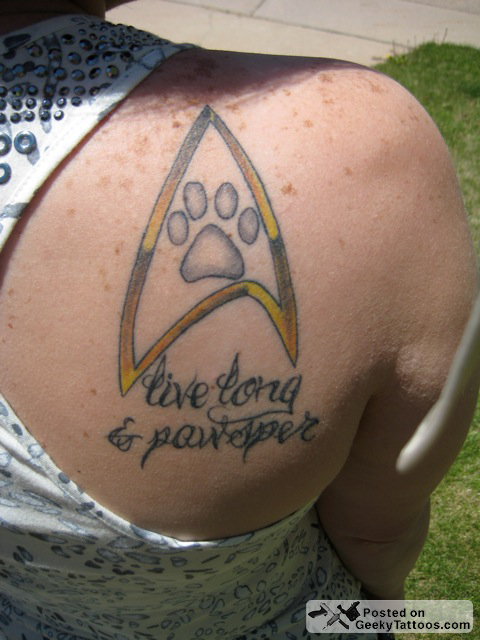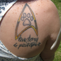 Heather runs a pet sitting company (Petcetera Pet Sitting) and loves Star Trek and Stargate Atlantis. This explains the shoulders full of geeky space show tattoos and the “Live, Long and Pawsper” one. I think she said that the constellation is the Atlantis origin point and the arm full of Stargate Atlantis tattoo tells you how to get to the Pegasus Galaxy from Earth, but I get lost in my own apartment sometimes so what do I know?