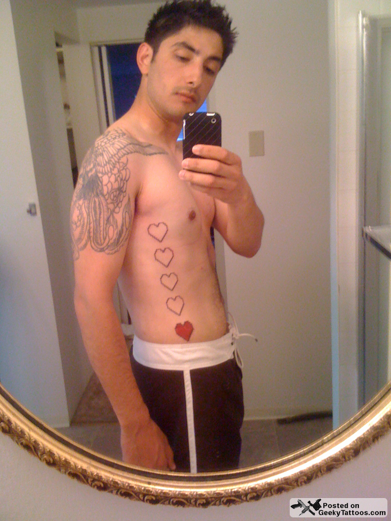 Here’s a new twist on the Zelda hearts tattoo: After growing up playing Zelda on the NES with his brothers, Ricardo got 10 hearts (5 on each side) tattooed as a reminder of the 10 things he needs to do before he dies. He’s got one filled in so far (skydiving) with 9 to go.