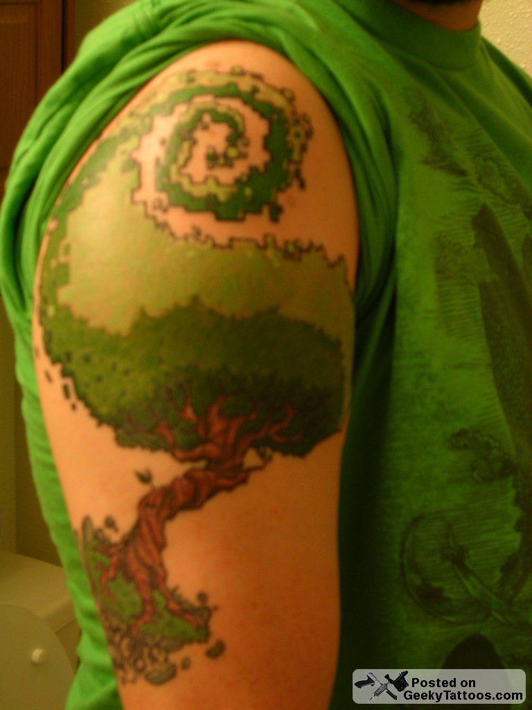 Remember Kyle’s pixelated tree tattoo that I posted an in-progress photo of last month? Well, he sent me the above photo of the finished product. Looks even more awesome in full color! I know the pic is a bit blurry, but just think of it as anti-aliasing.