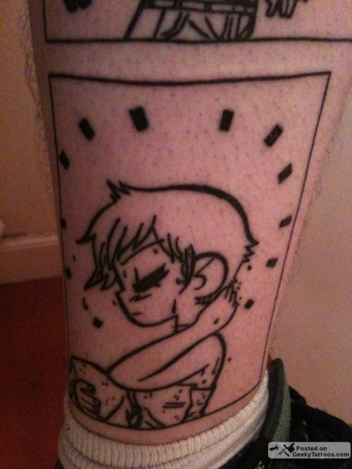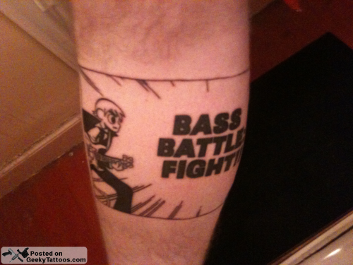 Yep, I’m still getting Scott Pilgrim tattoos sent in and you know what? I love it. This one however is on someone that’s no stranger to Geeky Tattoos. Apparently David didn’t get enough Scott Pilgrim ink when he got his “Level Up” tattoo. He said that he felt he needed to add Ramona, so y’know, he got her in a towel tattooed on his leg. It’s the only sensible thing to do. And then he got the bass battle one too because “the boss battles are so epic”. Give him a little more time and I think he’ll end up with the whole series on his skin.
