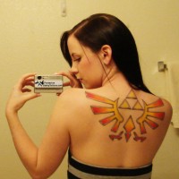 Jaqqi shows off her large Zelda back piece of the Zelda triforce. Love the coloring!
