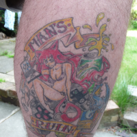 First up is Alastair‘s “Man’s Ruin” tattoo showing all of the vices that will be the end of him. He got it done by Gary at Living Colour Tattoo. Photo isn’t the best, but I also included the design it was based on, originally done by Nina Matsumoto