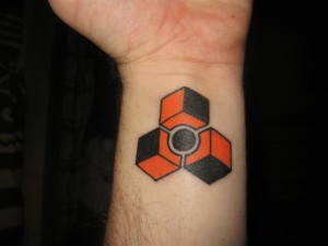 No really, this is a Reason tattoo. Josh Mobley is a composer for tv and films, and apparently has a fondness for Propellorhead’s software Reason. I’m sure this logo is quite meaningful to Josh given his line of work, but you can’t deny that it’s just an awesome logo period. I love the clean lines and the contrast of black and orange.