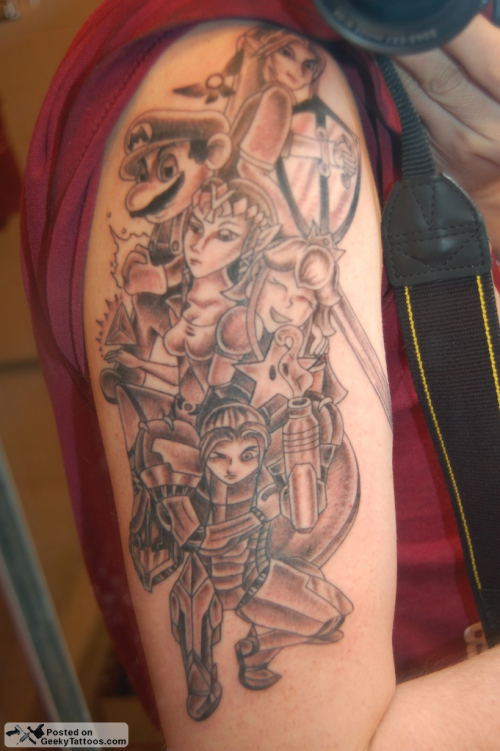 Gamer sleeves have to be on the top of my list of favorite geeky tattoos. I’m in luck that there are so many gamer geeks out there that get them so I can live vicariously through them. Today I’m living vicariously through Sean and his Nintendo sleeve. It features the classic characters: Link, Mario, Zelda, Peach, and Samus. He says he’s going to continue to expand it with other characters like Mega Man, Ryu, and Tron.