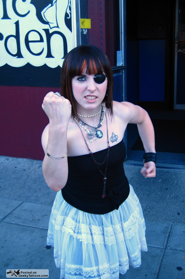 In addition to the Stephen Hawking quote, she also has the Starfleet Communicator on her chest. There are a number of reasons why people get this tattoo; Dawn describes hers: