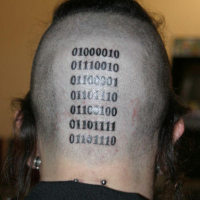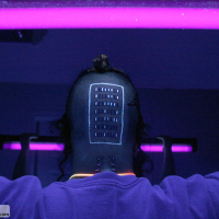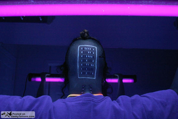 Moving around to the back of his head he has a binary tattoo with the ones done in UV reactive ink. The digits spell out his name.