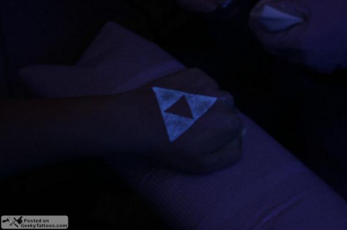 We’re not done yet! A fan of the UV reactive ink, Brandon also has a set of knuckle tattoos that spell out “GLOW LIFE”. The shot here is when they were still healing. They’re actually invisible until you toss a blacklight on them. Plus he has a triforce on the back of his hand!