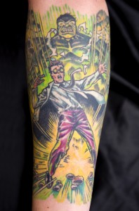 Eric McFee is the proud owner of this beautifully done splash page of the Incredible Hulk (as drawn by Dale Keown) on his arm. He’s a little bit of a fan of Hulk, having several hundred issues, trades, hardcovers, t-shirts and more and has been following Mr. Banner for many years. It’s not his only tattoo though, as he has about a dozen. This one was done by Hell*n at Skullduggery Tatu in Belfast, which is in Northern Ireland.