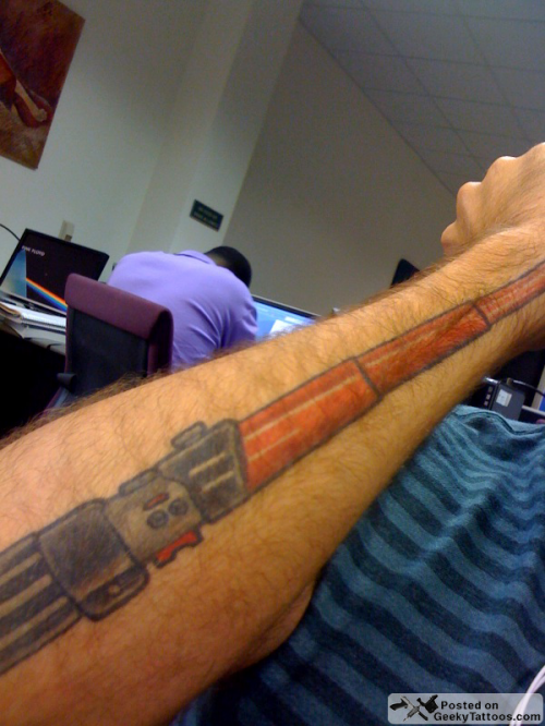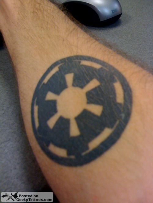 Matt sent in his two Star Wars tattoos. The first is of one of those plastic extendable lightsabers, Darth Vader’s to be specific. It runs along his outer forearm from elbow to wrist. While he was at the tattoo shop sketching out the light saber, he says that the Imperial March came up on the iPod playing over the shop speakers. It was fate. The second is the sign of the Empire, which he and his friend both got after a long stint working on the Death Star, err I mean before they left for college.