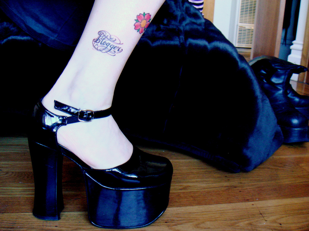 My friend Violet Blue is a blogger. She’s also an author, columnist, podcaster, artist, sex educator, and more (but that’s not what she got tattooed on her ankle). She got the fanciful blogger stamp on her body from Scott Sylvia at Black Heart Tattoo back in 2006, and it’s still more than relevant today. It’s not her only ink (she also has cherry blossoms that stretch the length of her body), but it is definitely her geekiest. And on top of things she’s proud of all her tattoos, refusing to let any of them be covered up even for television appearances (NSFW).