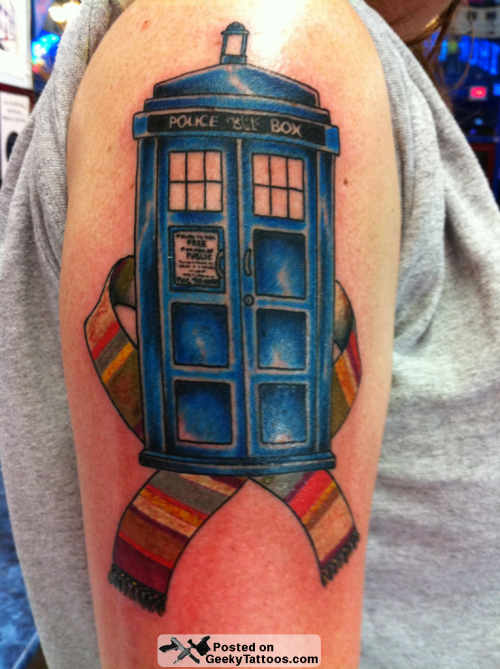 What do you get when you run a Doctor Who scarf-knitting website and a full size Police Box prop? Obviously this tattoo. Tara Wheeler is the owner of this ink done by Jon Reed at True Blue Tattoos.