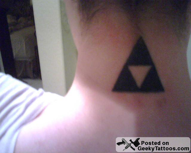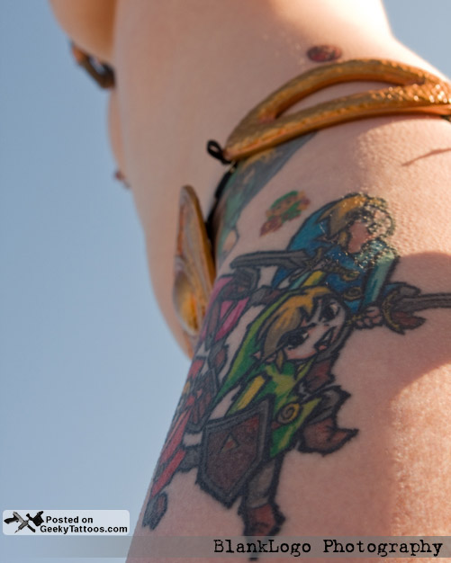 Alyssa sent in a bunch of photos of her geeky tattoos to share with everyone. She’s definitely got a thing for Zelda as her upper thigh/hip piece consists of official art from SNES, a sprite from the original NES game, and official art from The Legend of Zelda: Four Swords. In addition to her leg piece, she also has a life meter on her chest and a triforce on the back of her neck. But my personal favorites are not the Zelda tattoos she sports, but rather the pinball flippers on her lower back with buttons on her side. She calls them her “interactive tramp stamp”. As if all those tattoos weren’t enough to earn a post on GeekyTattoos, she also sent me photos of her tattoos with her dressed up as Slave Leia for extra bonus geek points. *swoon*