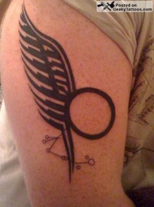 Bryan writes in to show us his Battlestar Galactica tattoo. It’s inspired by Starbuck’s tattoo on the show and Bryan is a huge fan of the show. In the show, Starbuck’s husband, Anders, has a matching tattoo that lines up to form the symbol of Caprica when they embrace:
