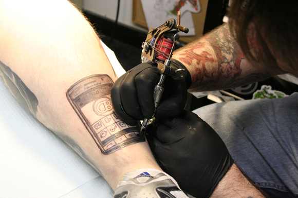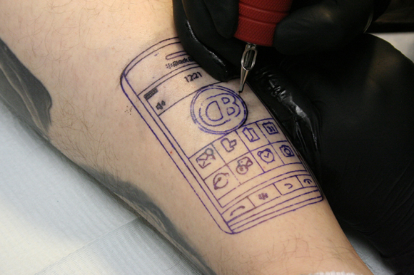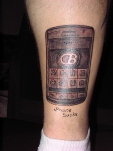 Here’s one that’s been making the rounds on the Internets lately. Crackberry.com, a site for Blackberry addicts, recently held a contest asking “What Would You Do for a BlackBerry Storm?”. The winners would all receive a free Blackberry Storm. Not surprisingly 187 people said they’d get a tattoo, but the one chosen was T.J. who said he’d get a tattoo of the actual Blackberry Storm with “Iphones suck” under it. And to top it off his tattoo was done by a die-hard Apple fan wearing an Iphone shirt.