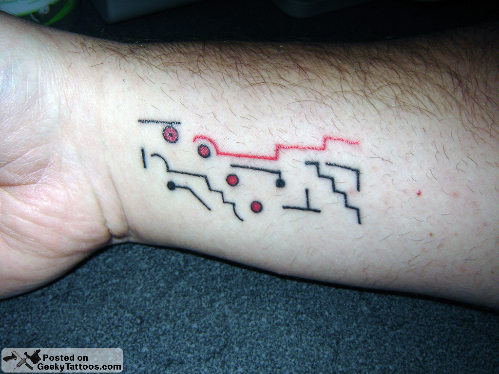 This tattoo is probably only geeky if you’re really into music, and more specifically ambient music. The tattoo is from Brian Eno‘s album “Music for Airports”. It’s the graphical music notation for the first track on the album. The owner is Jim “htmldeity” Dlugosinski and he wanted to both have a bit of art as well as a good conversation starter. He says that he’s had a number of conversations with total strangers inquiring what the odd symbols are on his inner wrist.