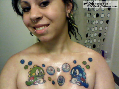 Bubble Bobble is one of those addictive and fun games that many of us grew up with. It’s also one of Keesha’s favorite games that she still plays today. So she decided to get Bub and Bob tattooed above her err on her chest. She says it was extremely painful (I can imagine!) but so worth it. Greg at Dark Star Tattoo delivered the pain and this awesome tattoo.