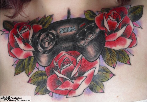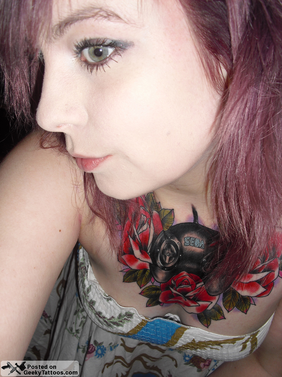 I had this chest piece done because I am a huge gamer, I was literally bought up on games. I remember days when the whole family would pull a sick day to complete a game together, was a good child hood. The console that I first played, when I was just three years old, and was a big part of my child hood was the Sega Mega Drive, which is why I decided to have the controller as the central piece for my chest tattoo. This console is my roots and has a lot of meaning to me and a lot of good memories that I would not change for anything. I am also a massive Sega fan, I was definitely a Sonic girl, I was absolutely addicted to it and to be honest I still am, I still have my old Mega Drive and break it out every now and again to have a Sonic day. I guess that is the main reason I got it done really, because the Mega Drive will always hold a place in my heart and led me into my career as it now stands as a games tester :)