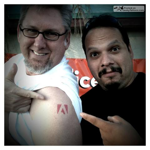 People love Photoshop. I use it almost every day. Chuck Vosburgh probably uses it a lot more than I do though, and I’m sure a bajillion times better. He’s an Adobe Photoshop instructor and must really love the software. He says bikers have their Harley logo tattoos, so he got the Adobe logo tattooed on him! I’m sure Photoshop is a lot quieter than those Harleys that like to blast through my neighborhood while I’m trying to hear what Elder Lyons is saying in Fallout 3. *fistshake*