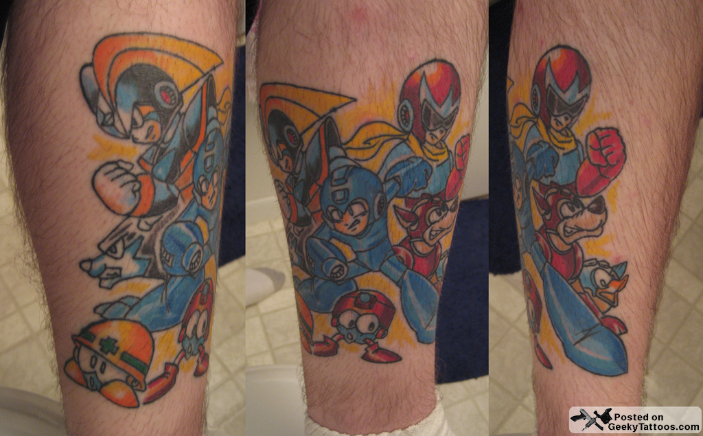 Hope everyone had a good Thanksgiving (for the US readers) and/or a great weekend (everyone)! Today I bring you Don and his geeky tattoos. First up is his classic Mega Man piece. He says he chose to stick with the old school cast (“none of that Mega Man ZX47-Zero-Battle Network-Plus-Alpha bulls*** that Capcom makes now”), however an exception was made for Bass and Treble since the artwork was too good to modify before committing to his skin.