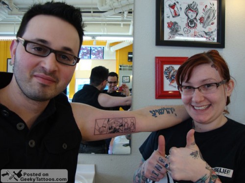 My name is Josh from New York. I just got back from a trip to San Francisco where I got this incredible Scott Pilgrim tattoo from Karina at One Shot Tattoo
