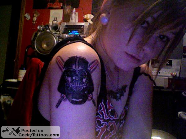 I’ve said it before and I’ll say it again. Darth Vader and light sabers is the new skull and crossbones. Angelica sent in a photo of he dedication to this “misunderstood character” (her words not mine). She says she’s always had a deep love for Star Wars and Darth Vader, so she had Paully at Tatts By Zapp tattoo the infamous Vader on her shoulder.