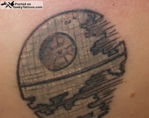 Glitterdovefairy didn’t say what her name was, but she (he?) did attach photos of Death Star and Enterprise tattoos that grace their left shoulder. Ink was done by Kyle at Gargoyle Tattoo in Aberdeen, WA.