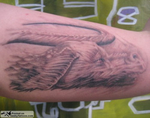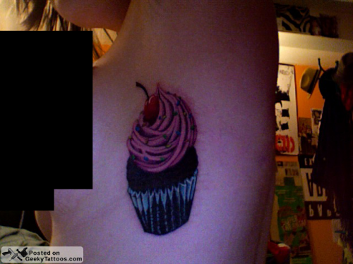 Crap, I used up all my NeverEnding Story material on another post. Uhh, here’s Maggie’s tattoo of Falkor, my favorite flying white dragon/dog creature. She says she got it for her older brother because they would watch the movie and he’d sing along and cry. That’s all I got. Well that, and a semi-nude shot of Maggie’s cupcake tattoo!