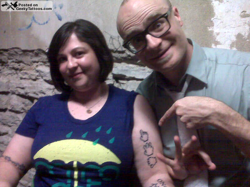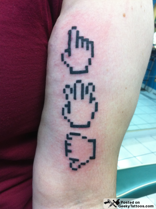 Natalie is a fan of nerdcore artist MC Frontalot. Back in September (yeah, I know I’m late on posting this) she went to one of his shows. During his song “First World Problem” he had the crowd put up one finger (“first”), then 3 fingers (W for “world”), and finally a thumbs-down (“problem”). Natalie loves the song and like many of use recognize this common hash tag on Twitter so she decided to get an 8-bit tattoo. Per at Dandyland Custom Tattoos in San Antonio, TX helped her out with this while they listening to Frontalot’s Pandora station.