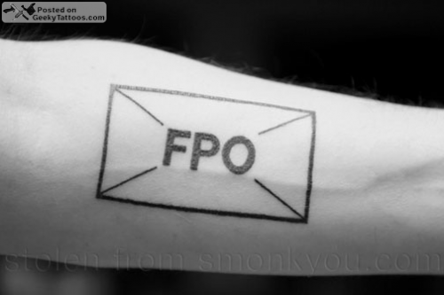 I wanted a tattoo on my forearms but I couldn’t think of what to get so I wrote FPO on one of my arms where the tattoos would go. FPO stands for For Position Only (or For Placement Only) and it’s a design term that basically says an image or empty space is just temporary. It’s still healing a bit so it’s a little flakey.