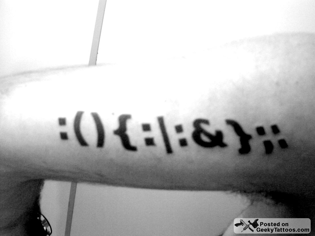 No, this tattoo isn’t some weird combination of emoticons and smilies. It’s what’s known as a “fork bomb” or a wabbit. No, it’s not what happens when the air force runs out of ammunition and starts dropping silverware drawers either. A fork bomb is a denial of service attack on a machine that basically makes it run as many processes as possibly, locking up the machine. The above tattoo on Silveira is one of the more elegantly simple examples of how to drop a fork bomb on a Unix machine.