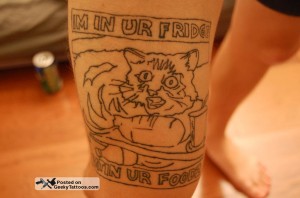 I knew it wouldn’t be too long until we found someone with a LOLcat tattoo after I posted it on the “Tattoos We’d Like To See” page.  Andrew was kind enough to send in his friend’s tattoo that you see above.  While not confirmed, I have a slight suspicion that it’s based off of the following pic: