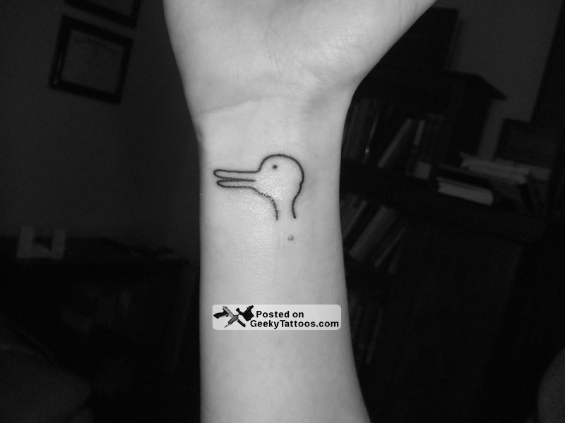 Kris Phillips, a Graduate Assistant in the Department of Philosophy at the University of Iowa, writes in to share his two geeky tattoos. The first is a drawing of Wittgenstein’s duck-rabbit from Philosophical Investigations. The second is an ancient Greek typewriter spelling out “Philosophia” in Greek.